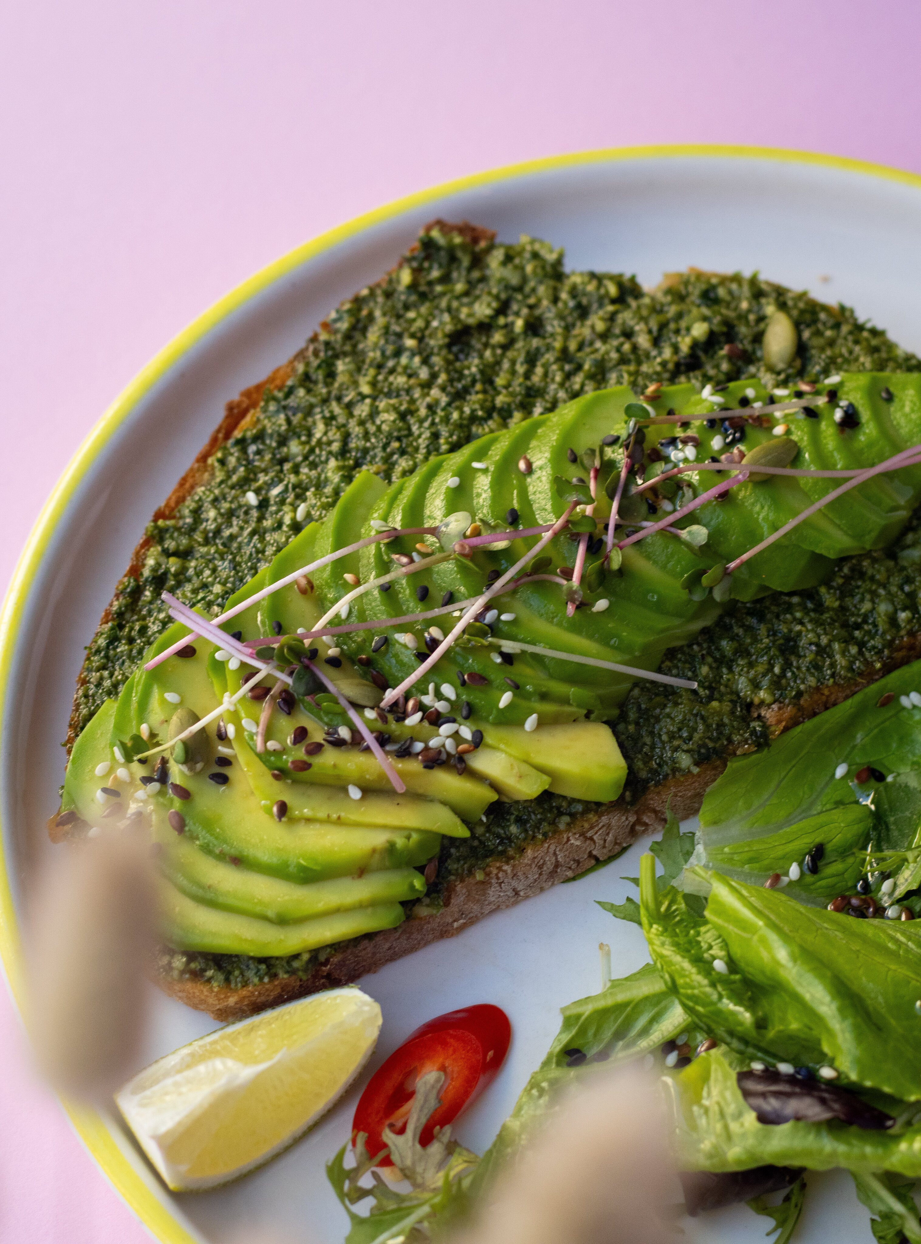 Хрустящий тост, соус песто, авокадо, микс салатных листьев: романо, шпинат, руккола , мангольд , бок чой , красный щавель, долька лайма и чили. Хлеб бездрожжевой.