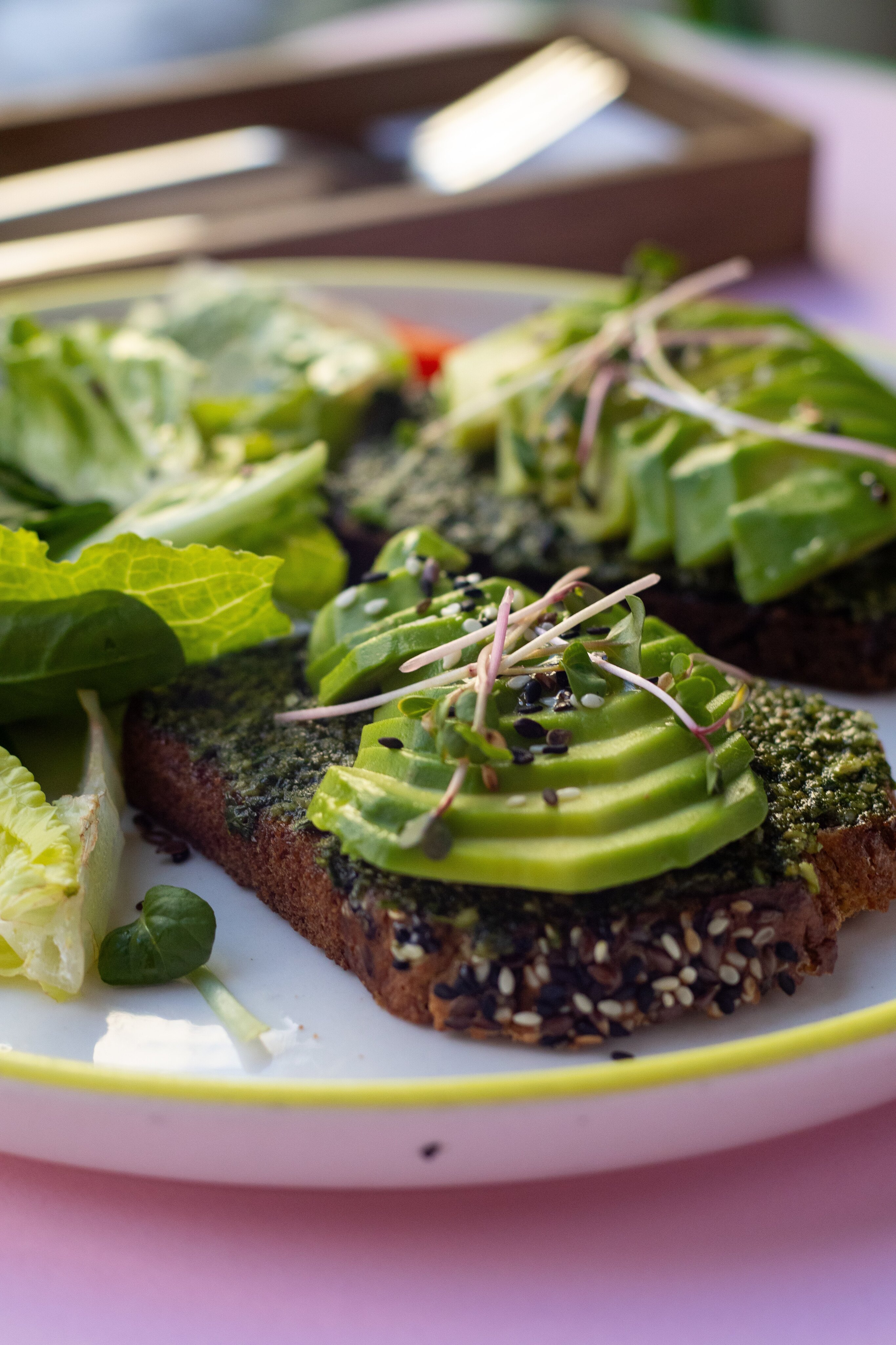 Хрустящий тост, соус песто, авокадо, микс салатных листьев: романо, шпинат, руккола , мангольд , бок чой , красный щавель, долька лайма и чили. Хлеб гречневый.