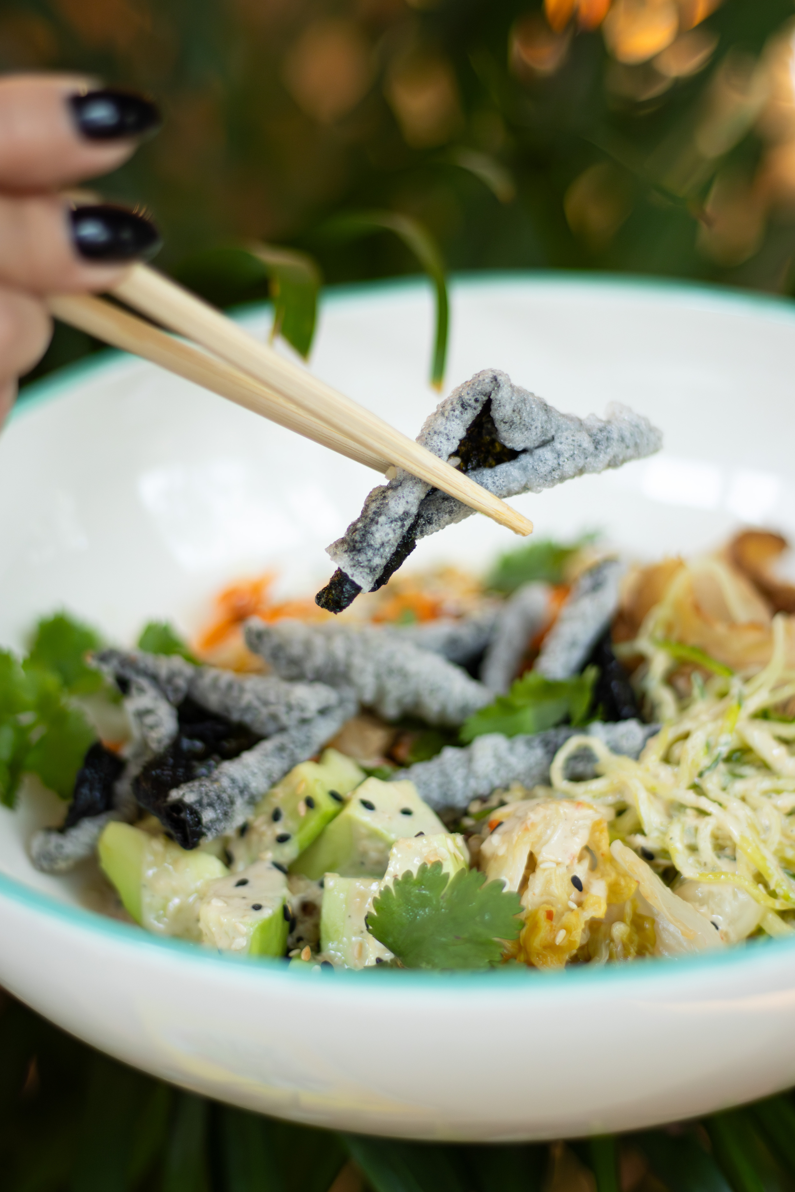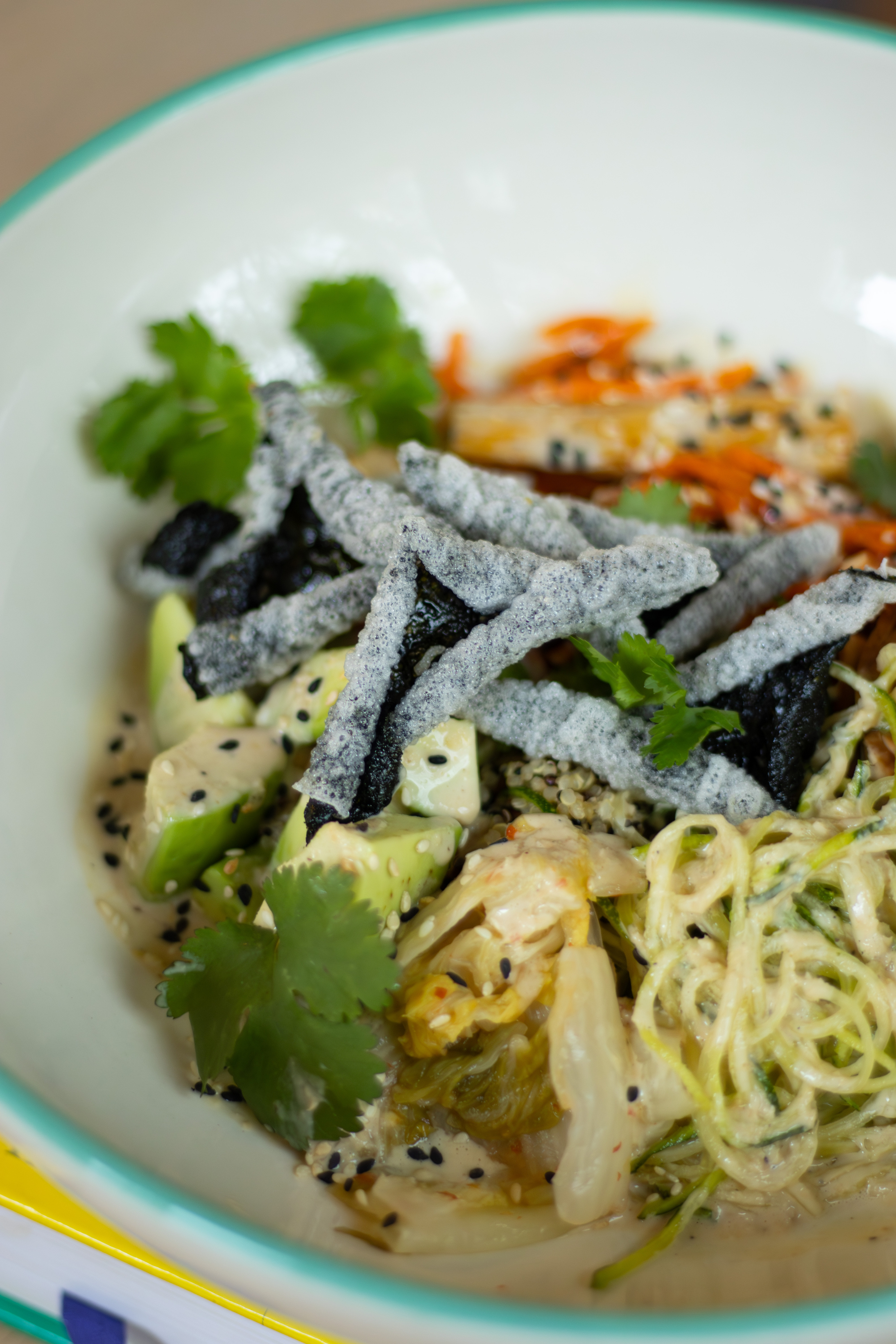 Копченый темпе, чипсы из нори с рисовой бумагой, киноа, авокадо, спаржа по-азиатски,капуста кимчи, цуккини, кунжутный соус. кинза, черный перец.