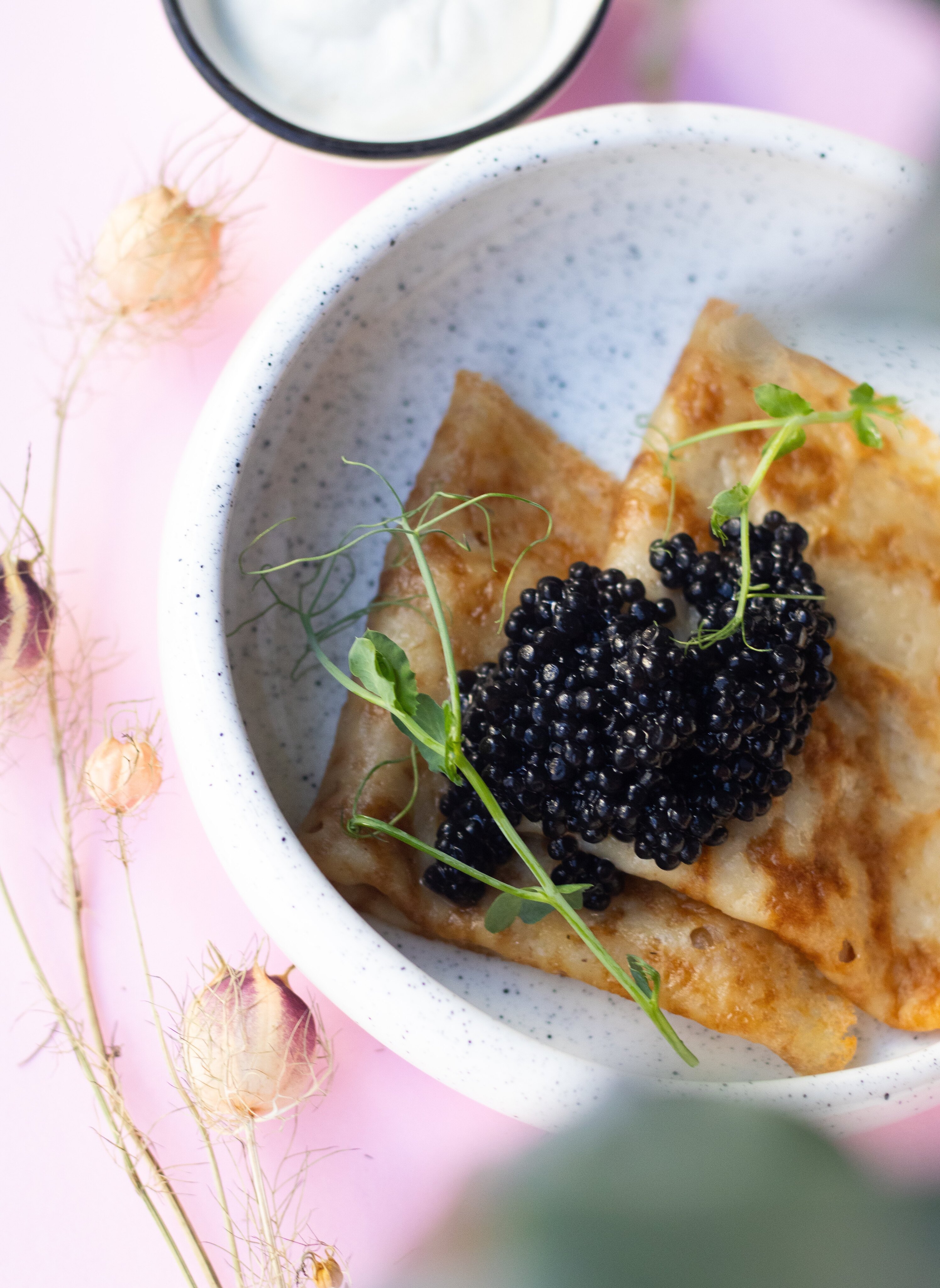 Блины на основе безглютеновой муки, кокосового молока и растительного масла. Без добавления сахара. Подаются со сметаной из кешью, "черной икрой" и микро-зеленью гороха