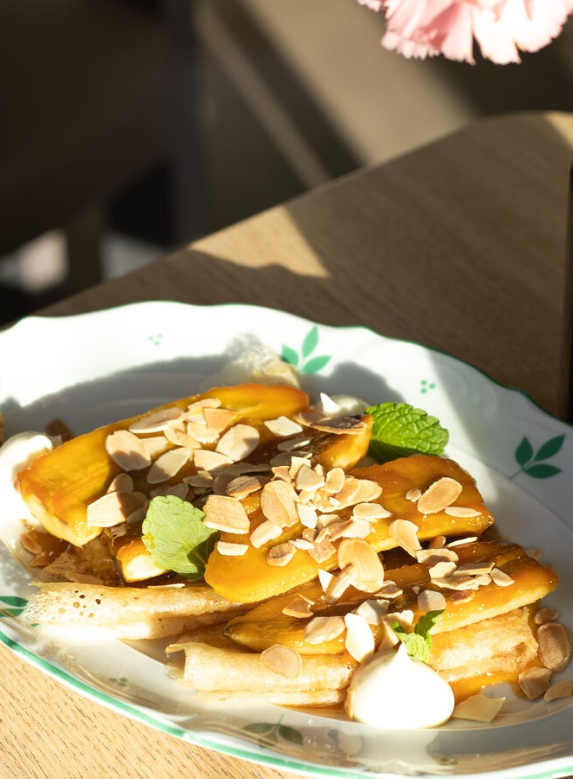 Безглютеновая мука, кокосовое молоко, сироп топинамбура, растительное масло. Карамель на кокосовом молоке и сиропе топинамбура, карамелизованный банан. Украшается ванильным ганашом, миндальными лепестками и свежей мятой.
