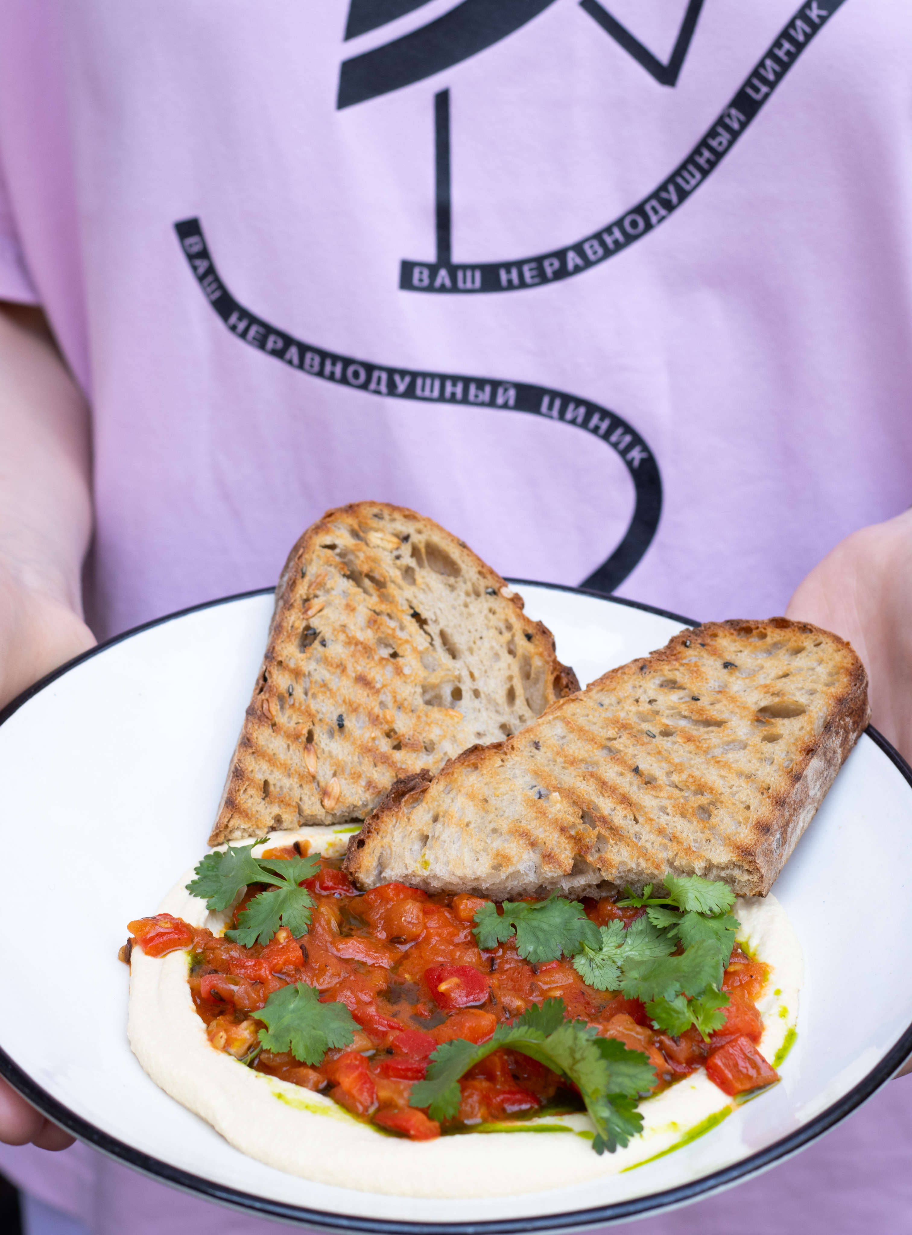 Хумус из нута, печёный перец, печёные томаты, зира, кориандр, зеленое масло, чеснок, кинза, гречневый хлеб без глютена.