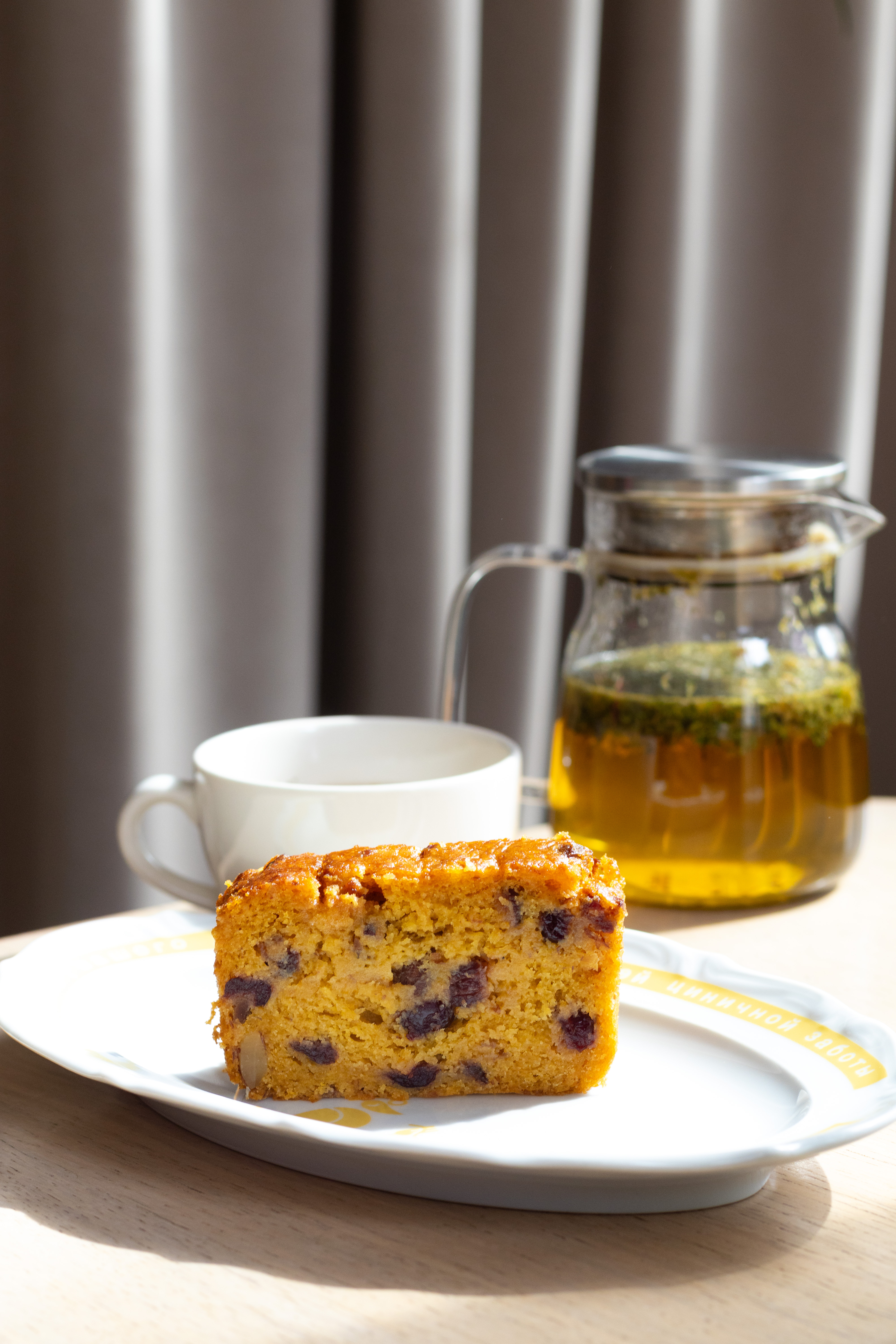 Мука БГ, Мука миндальная, рисовая мука, кукурузная мука, разрыхлитель, пюре из кураги, молоко кокосовое, сироп топинамбура, масло подсолнечное, масло кокосовое, апельсиновый сок, клюква сушеная, миндаль, цитрусовые цукаты.