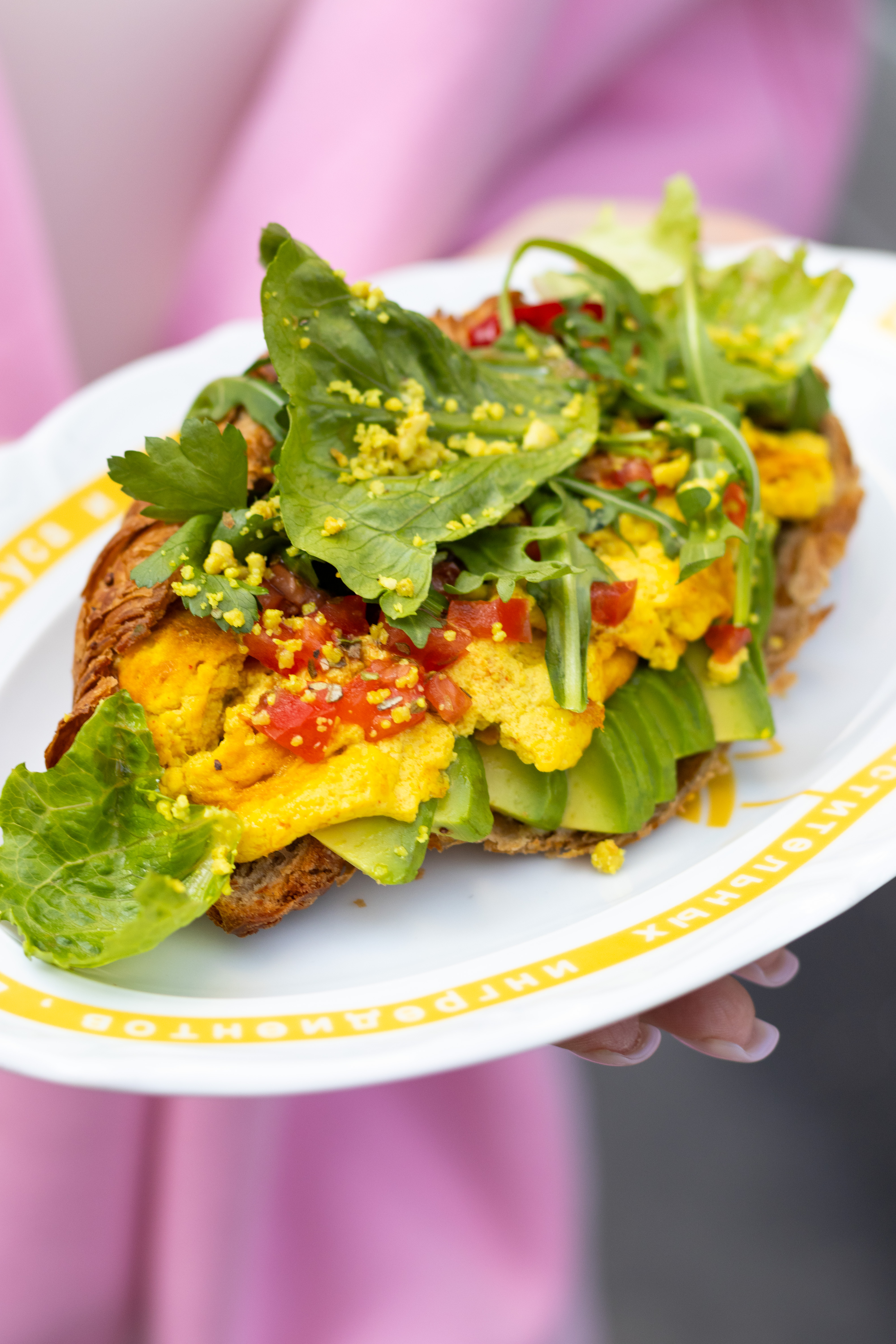 Нежный скрэмбл из тофу с кремовой текстурой, круассан из муки полбы с киноа, авокадо, томаты, соевое молоко, веган-сыр из кешью и кедрового ореха, романо, руккола, орегано,сок лайма, чили, оливковое масло.