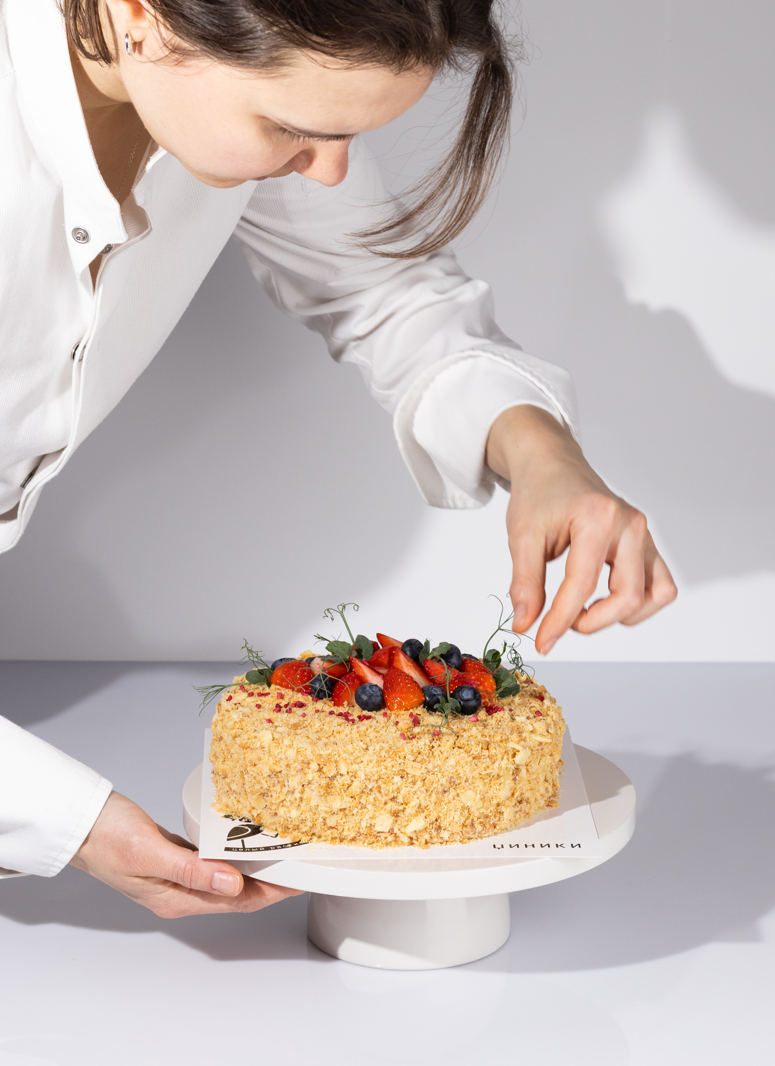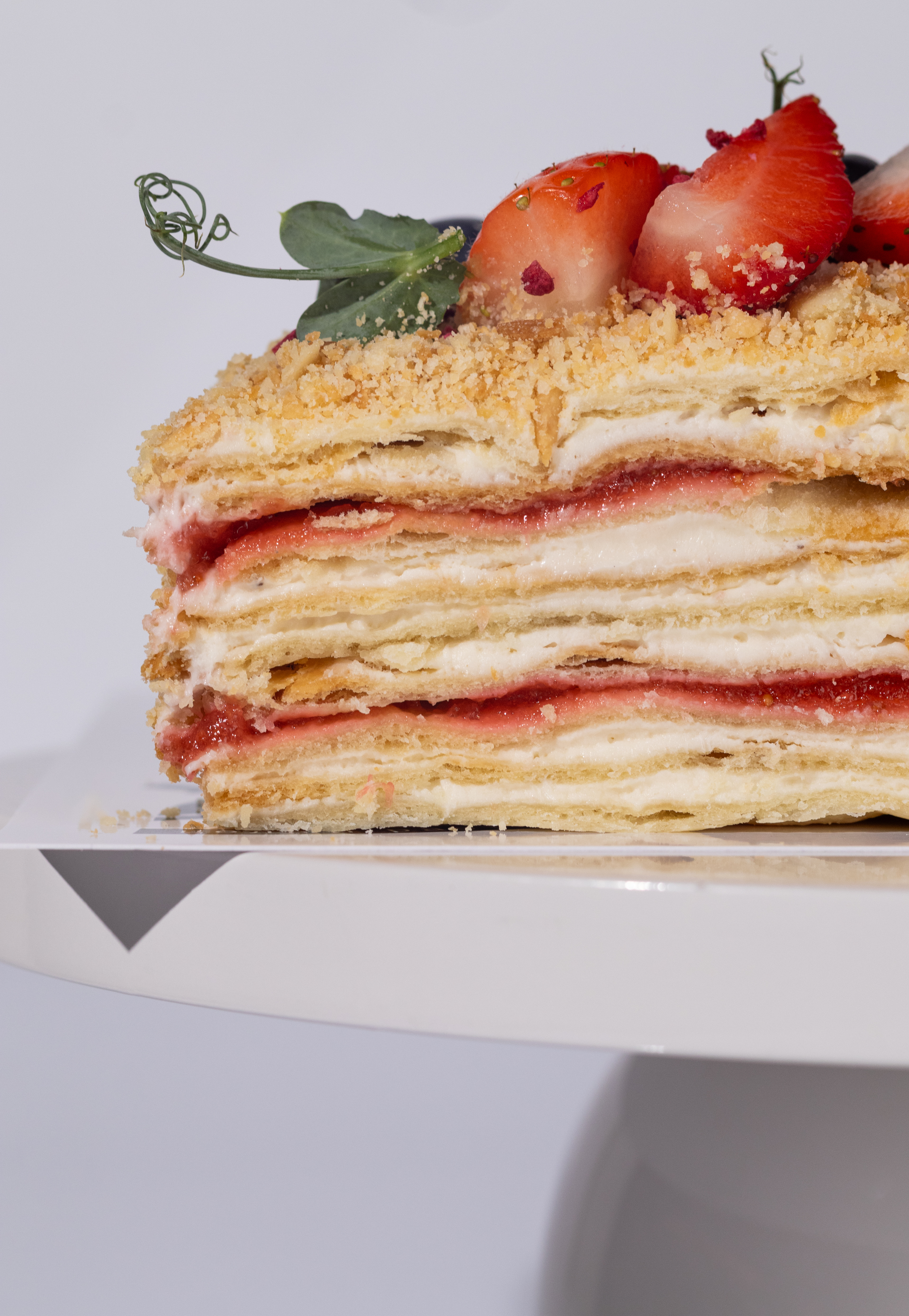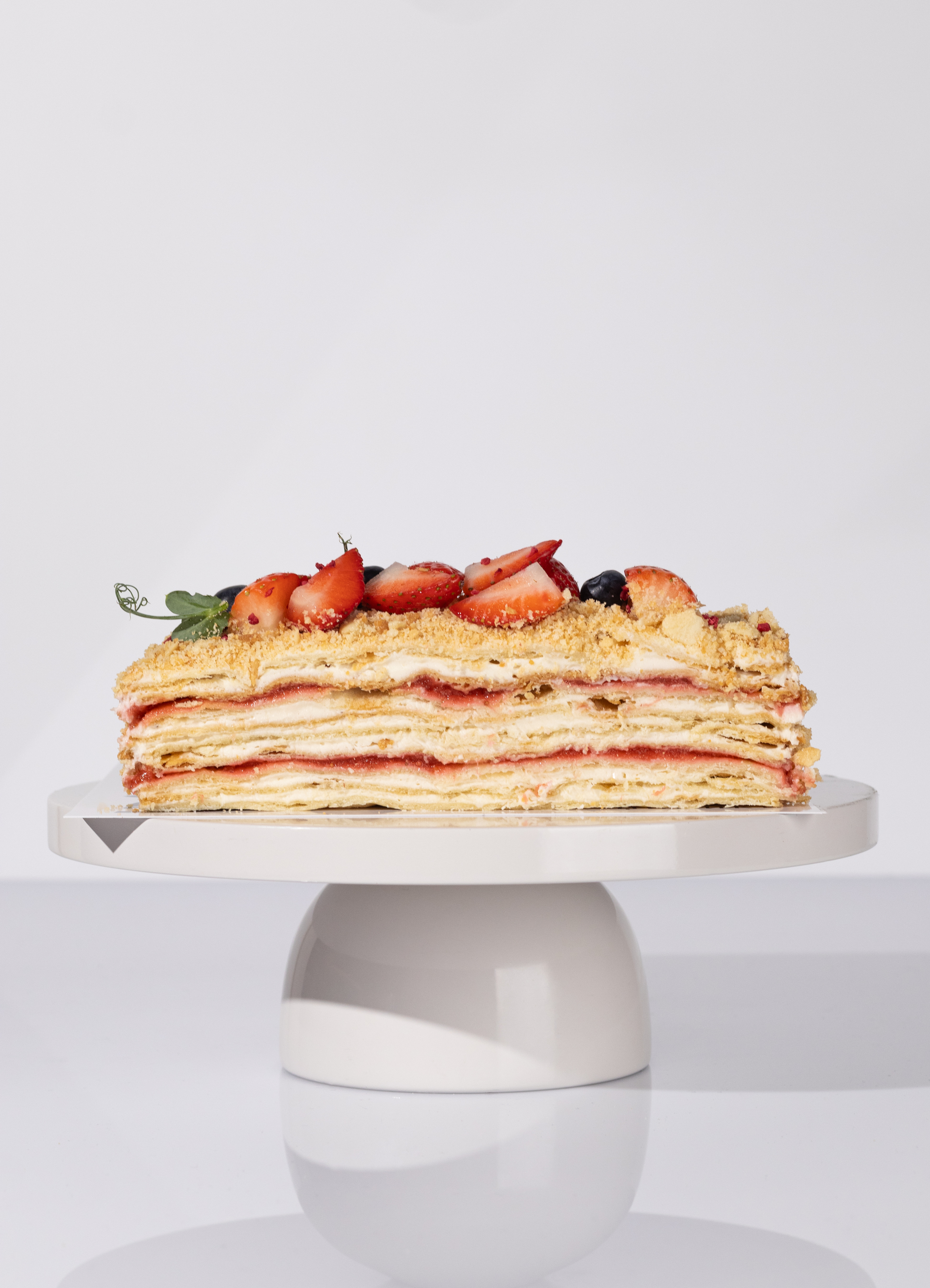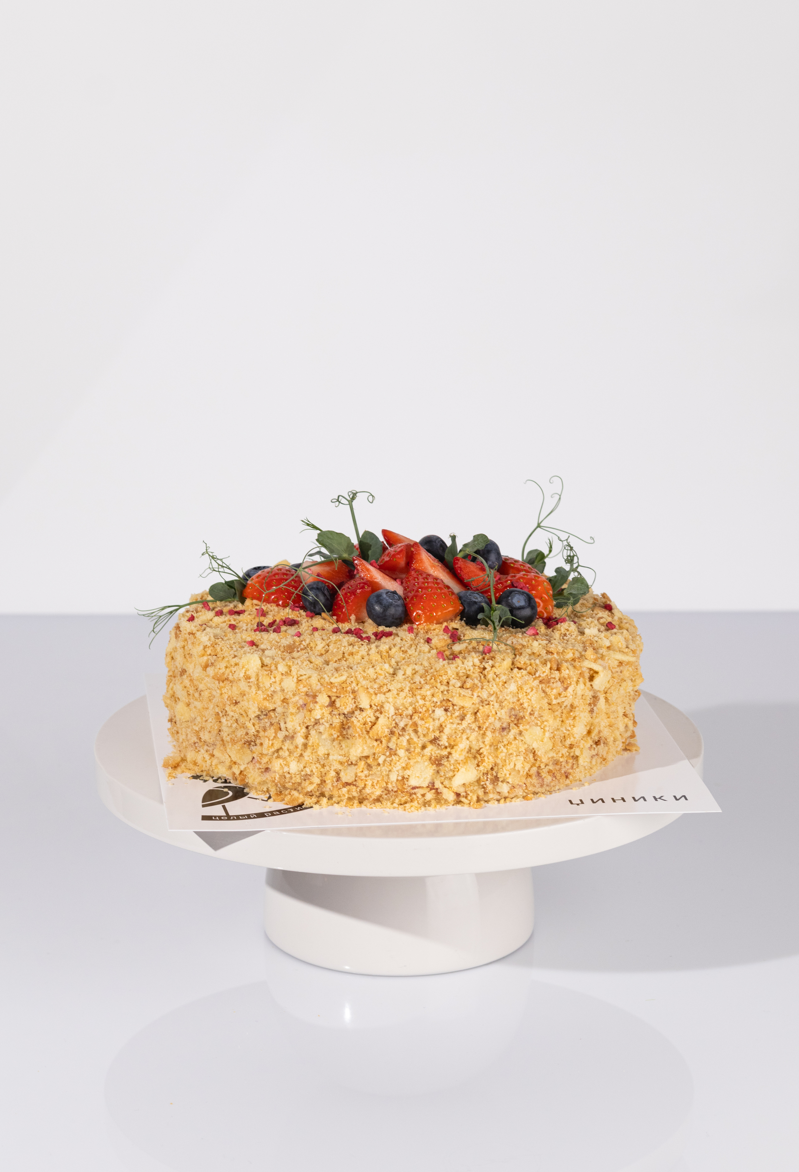 Пшеничная мука, кокосовое масло, сироп топинамбура, клубника, кокосовые сливки. Украшается свежими ягодами.
