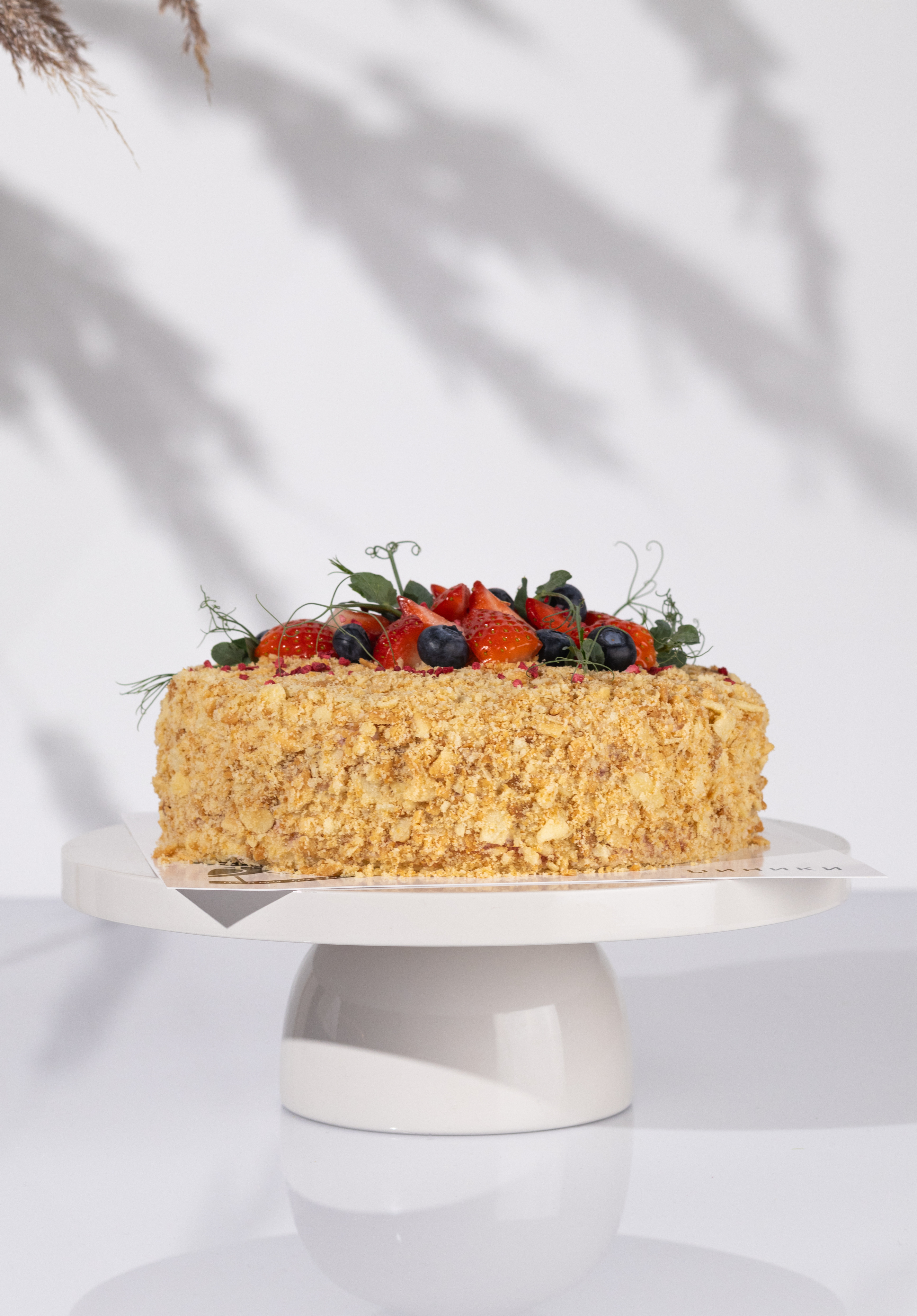 Пшеничная мука, кокосовое масло, сироп топинамбура, клубника, кокосовые сливки. Украшается свежими ягодами.