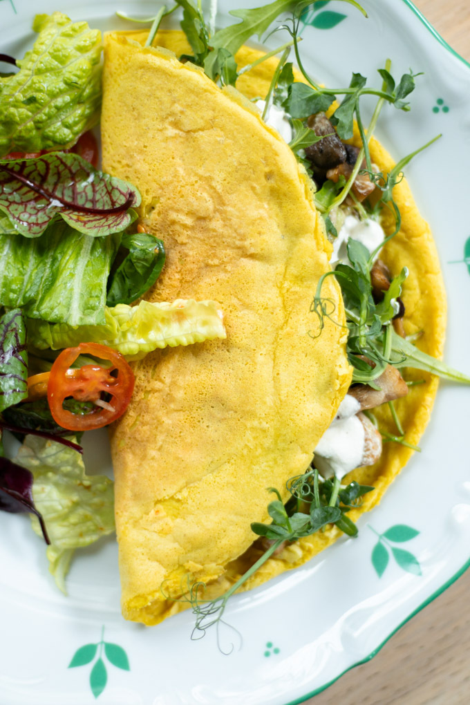 Омлет из нута, шампиньоны, вяленые томаты, салатные листья, кешью сметана с укропом, шпинат, томаты черри, оливковое масло, чили.