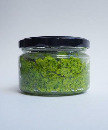 Состав: базилик, петрушка, орехи кешью, тыквенные семечки, оливковое масло, лимонный сок, соль.