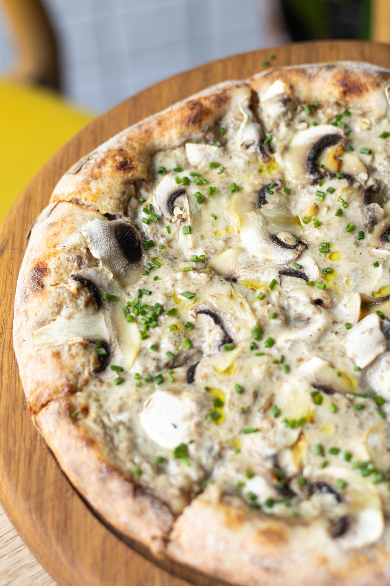 Грибы шампиньоны, грибной фарш, тесто из пшеничной муки на закваске, трюфельное и оливковое масло, лук сибулет, сливочный соус: белые грибы, шампиньоны, корень сельдерея,лук, перец черный, чесночное масло.
