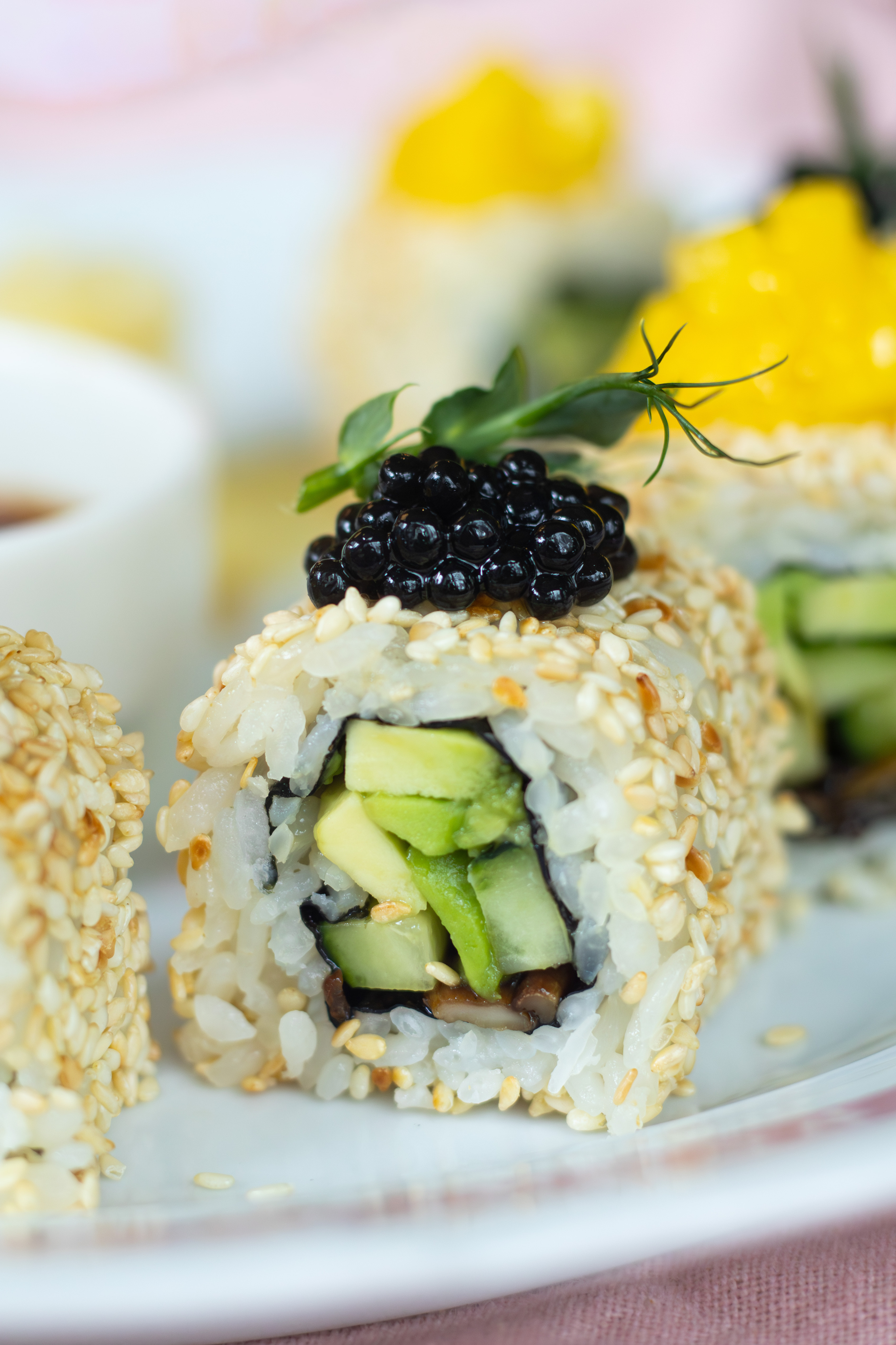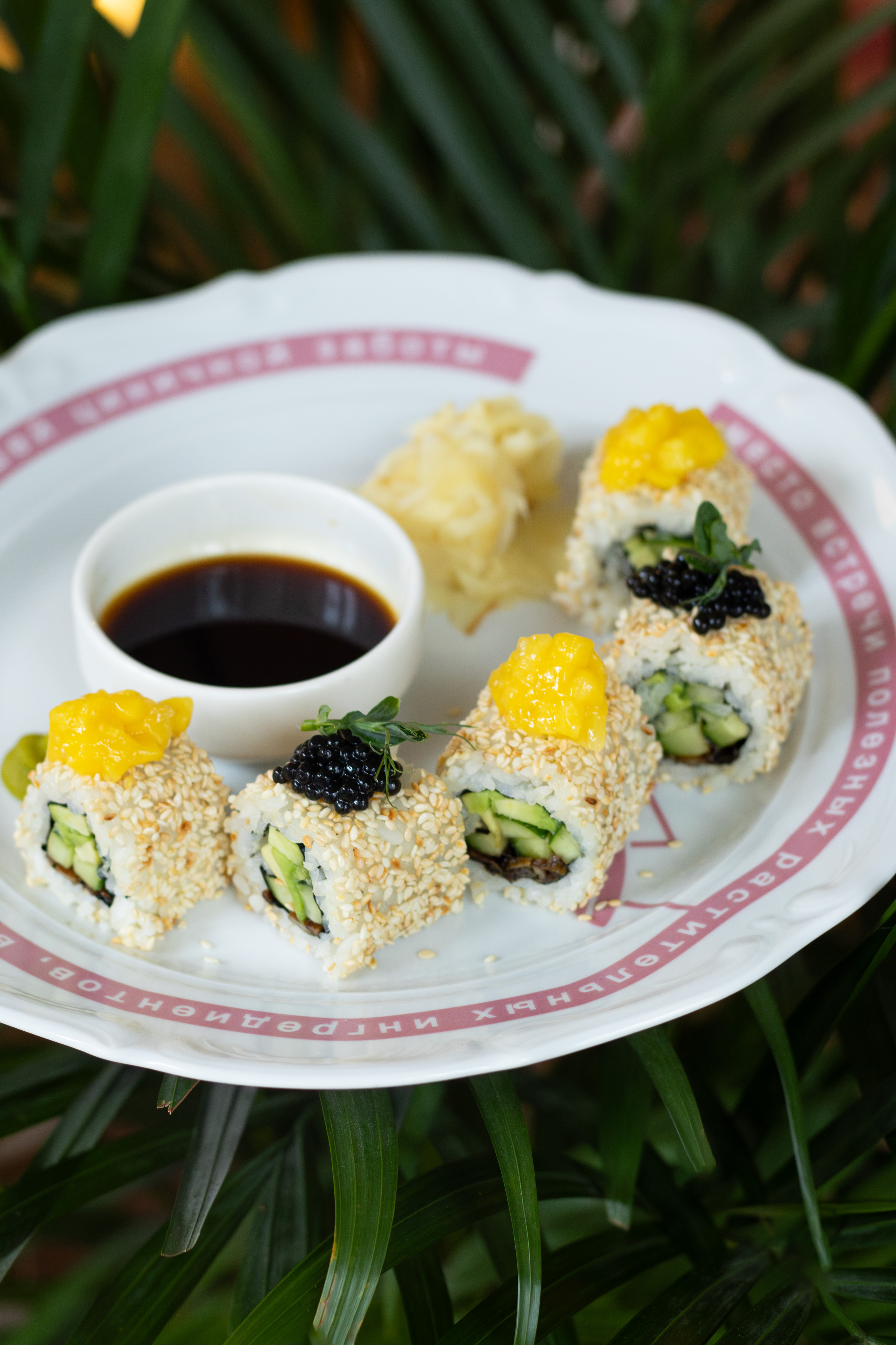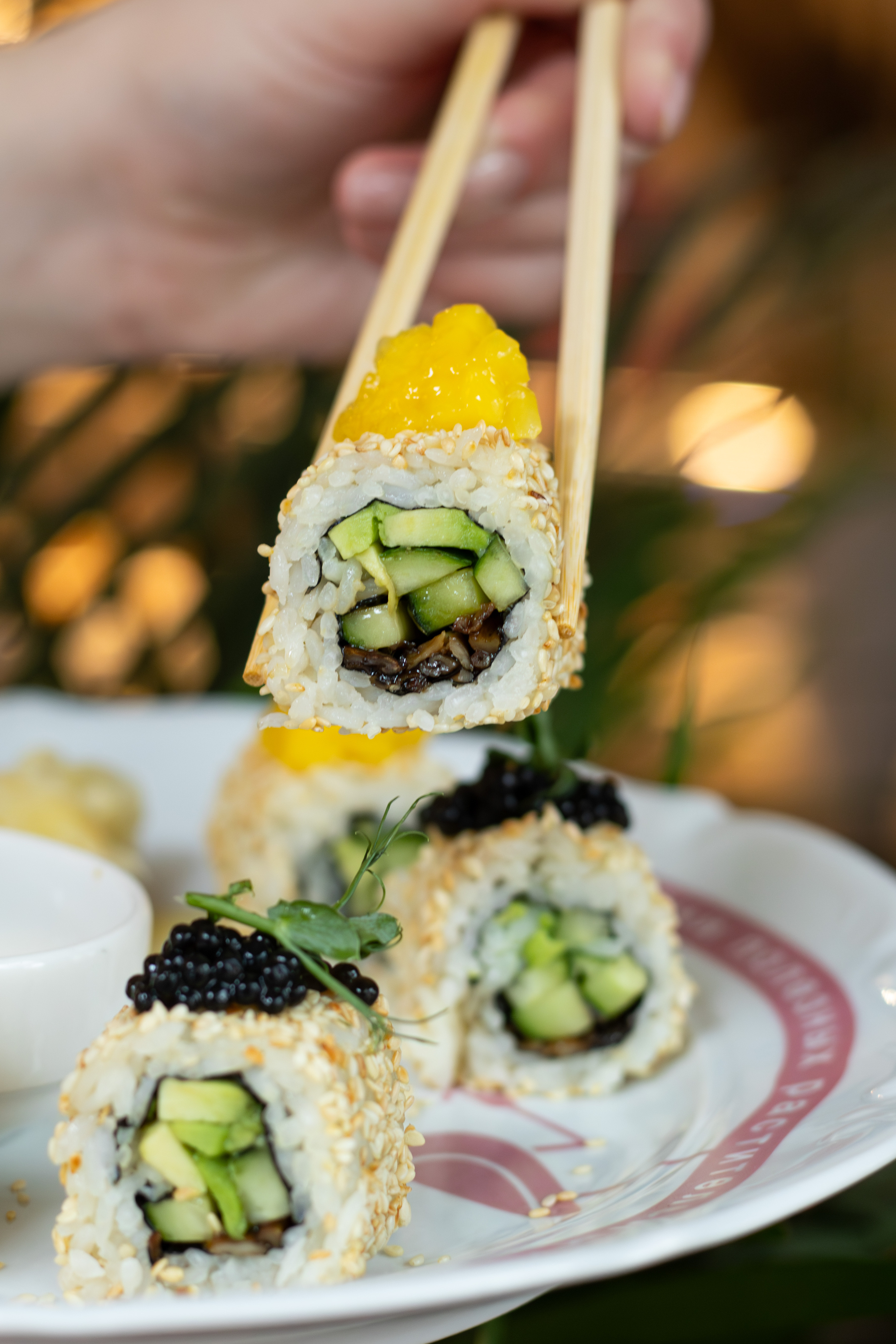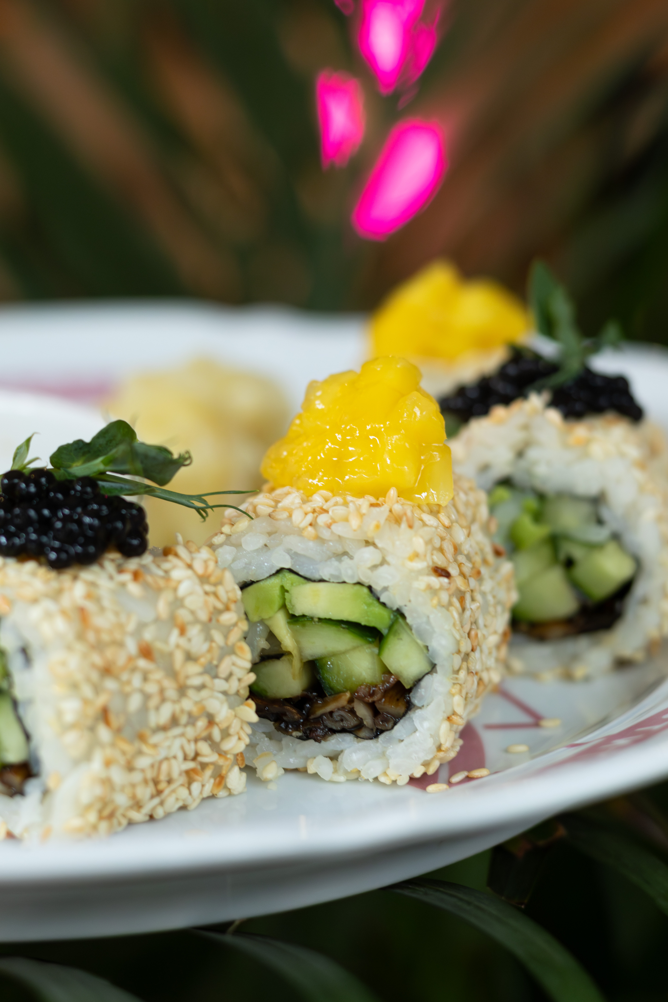 Чёрная веган-икра, манго, вешенки, авокадо, огурец, рис, нори, кунжут, имбирь, соевый соус, васаби.