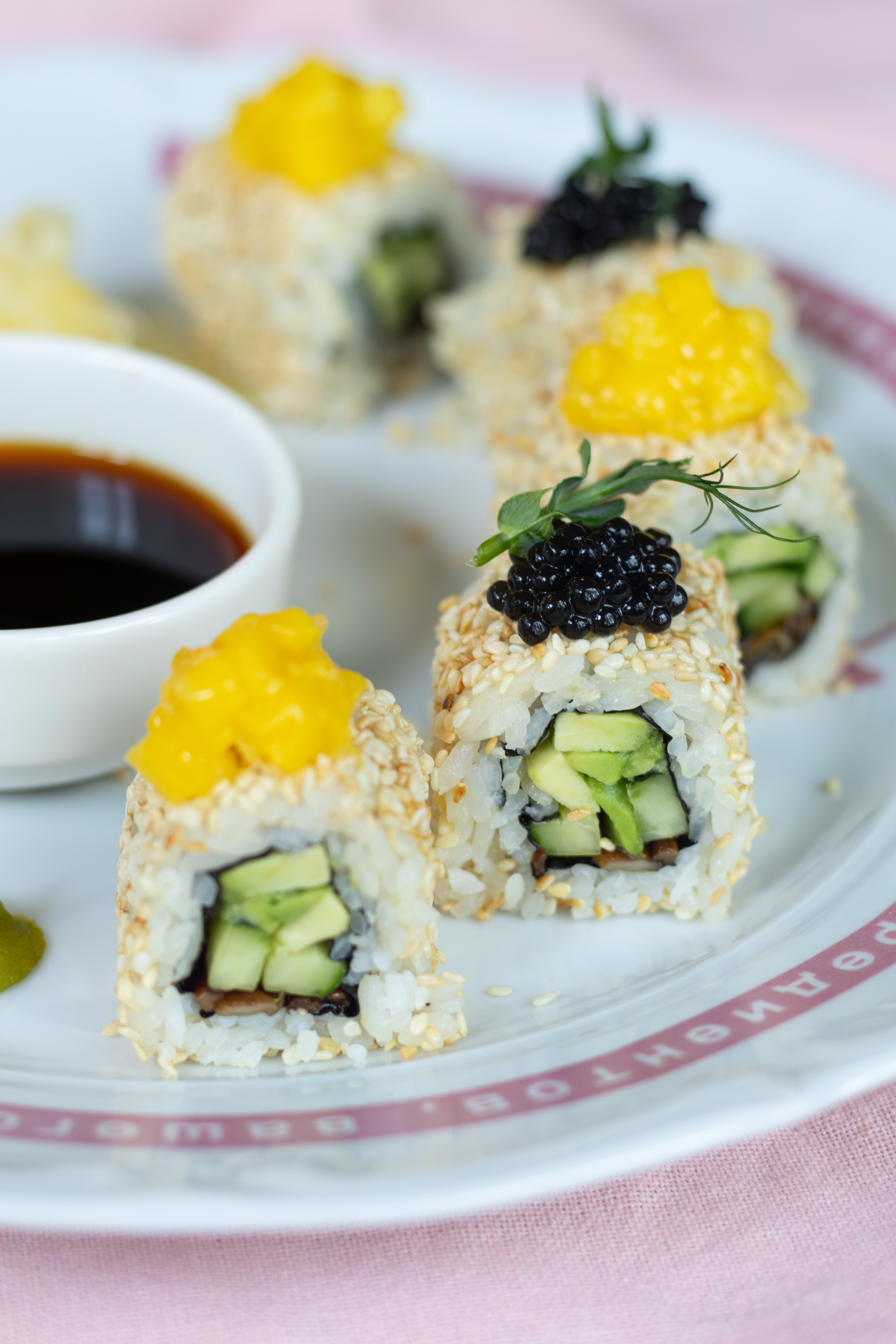 Чёрная веган-икра, манго, вешенки, авокадо, огурец, рис, нори, кунжут, имбирь, соевый соус, васаби.
