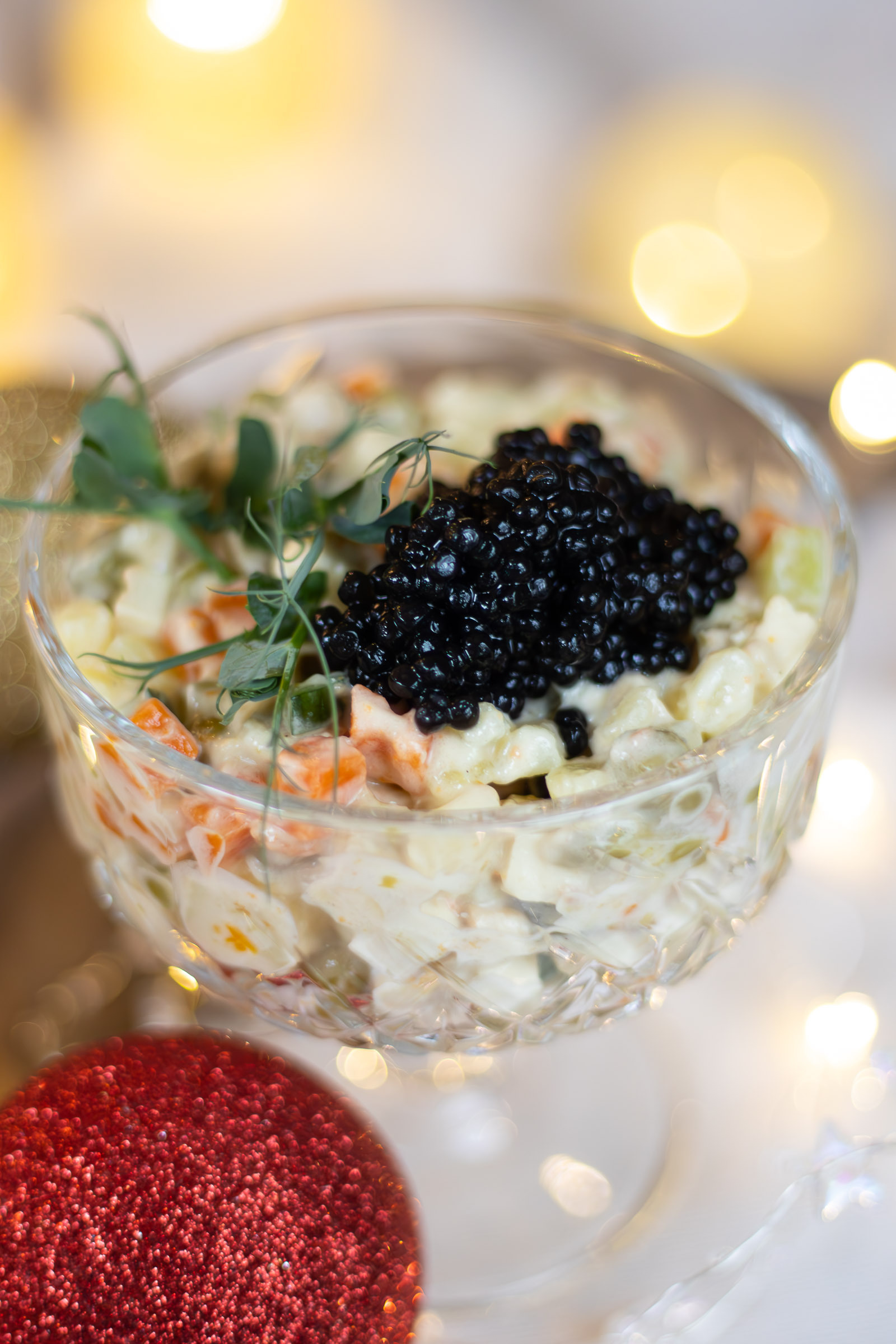 Картофель, морковь, зеленый горошек, копченый тофу, копченый темпе, соленый огурец, огурец свежий, веган-майонез, красная икра, черная соль, микро-зелень.