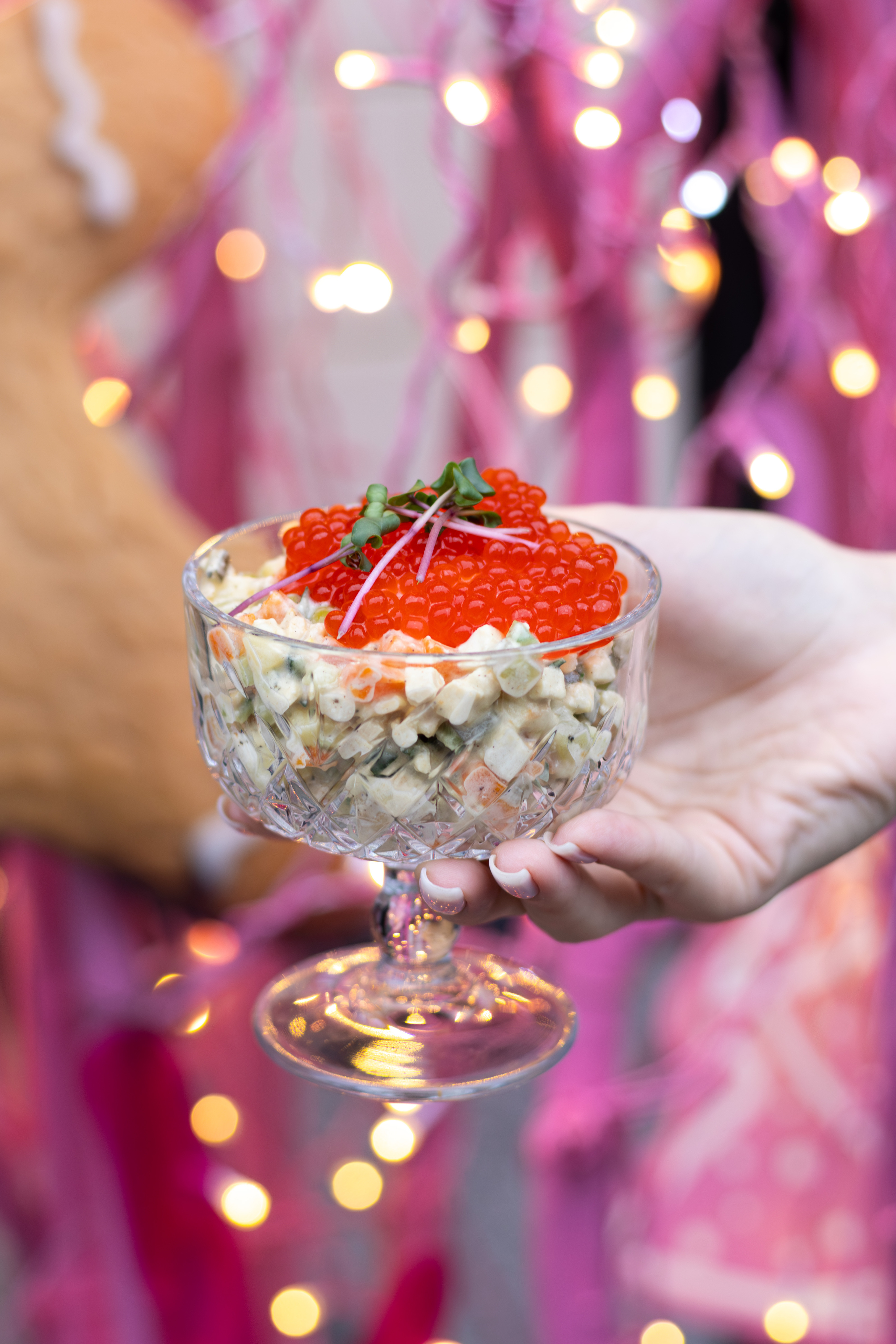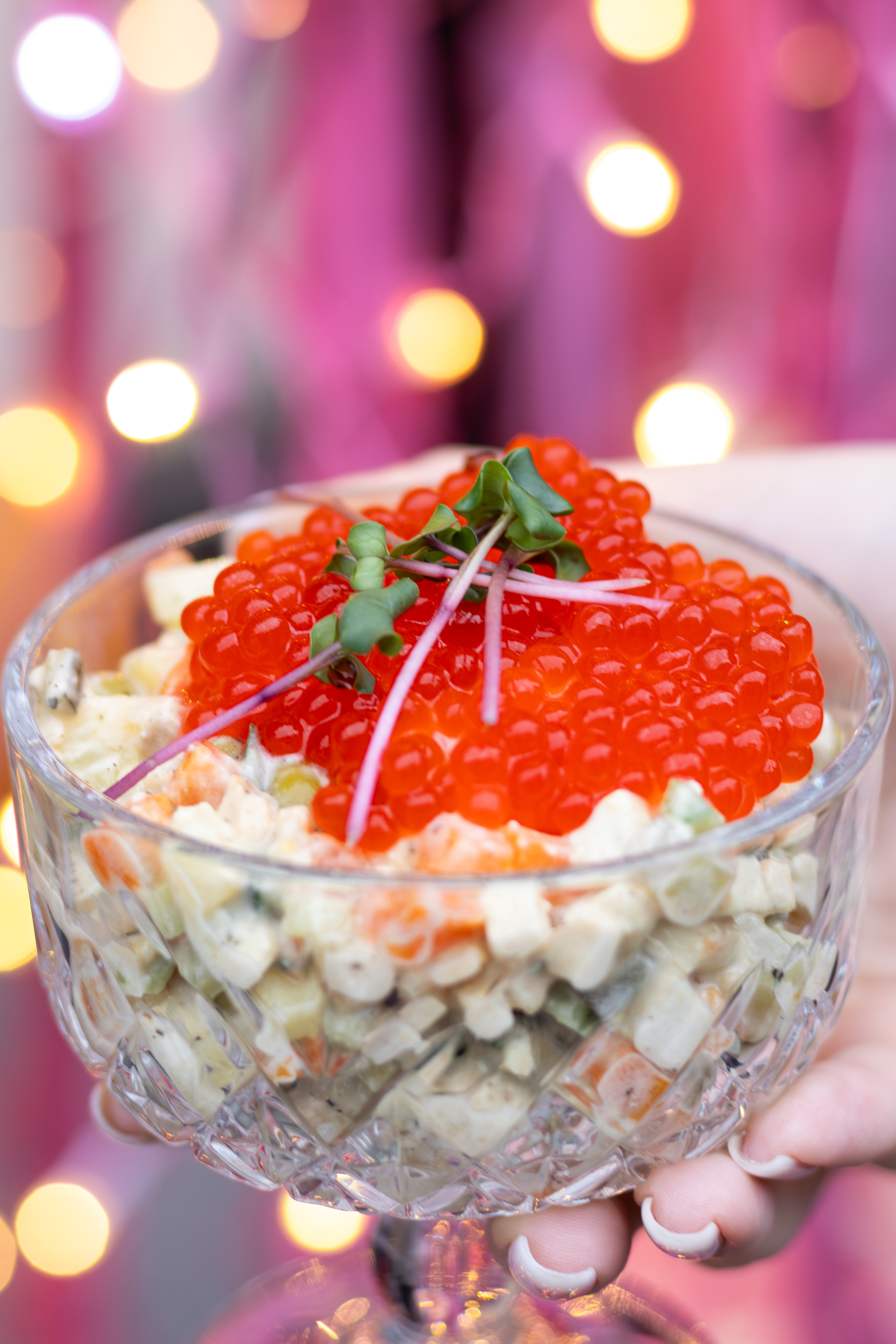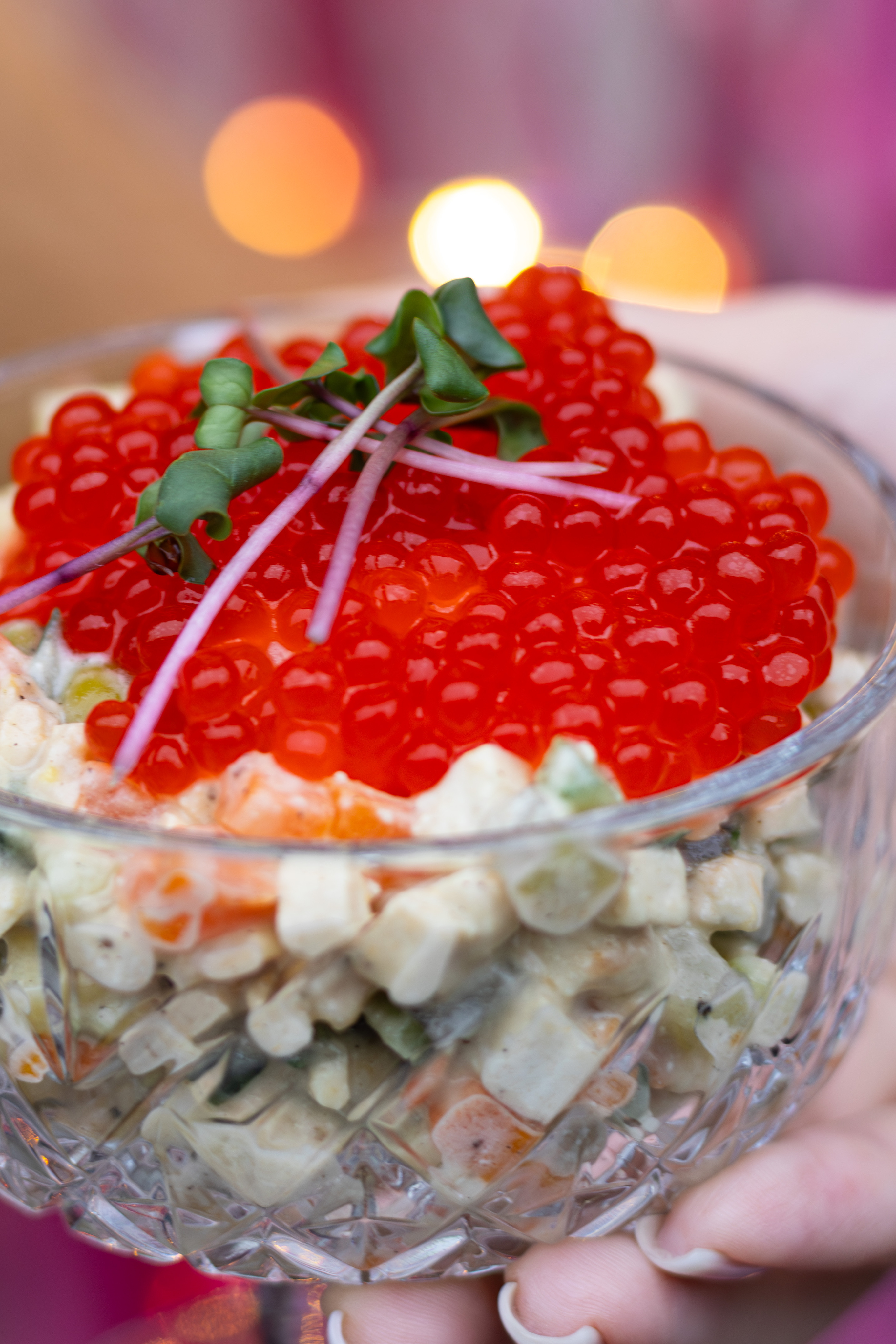 Картофель, морковь, зеленый горошек, копченый тофу, копченый темпе, соленый огурец, огурец свежий, веган-майонез, красная икра, черная соль, микро-зелень.