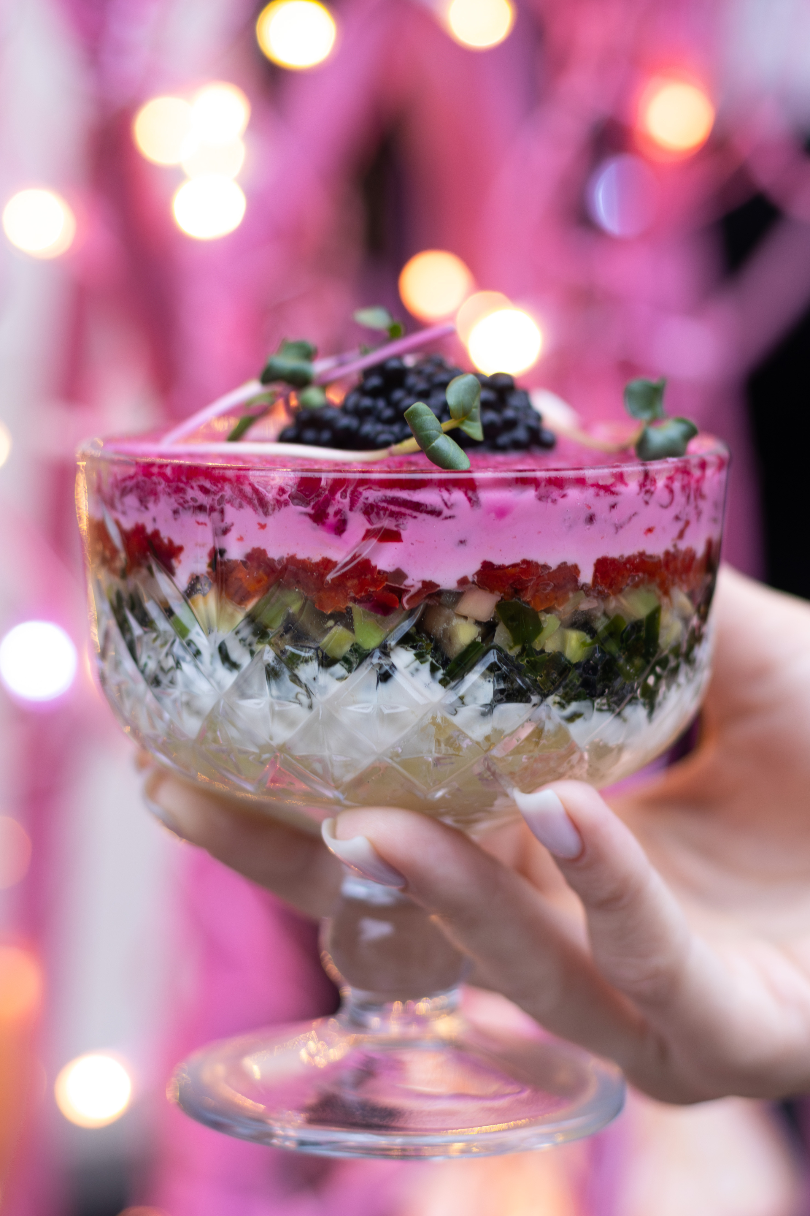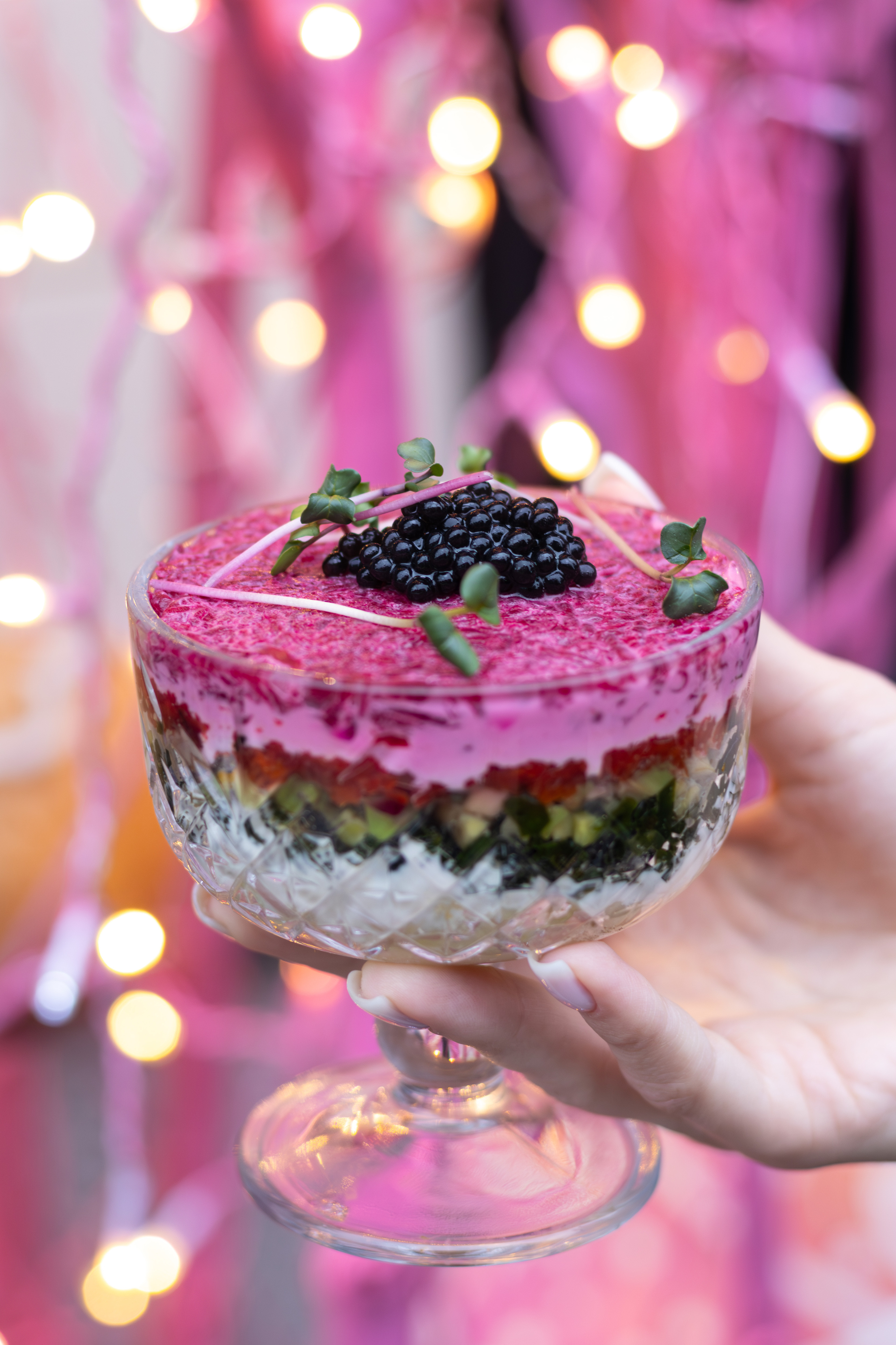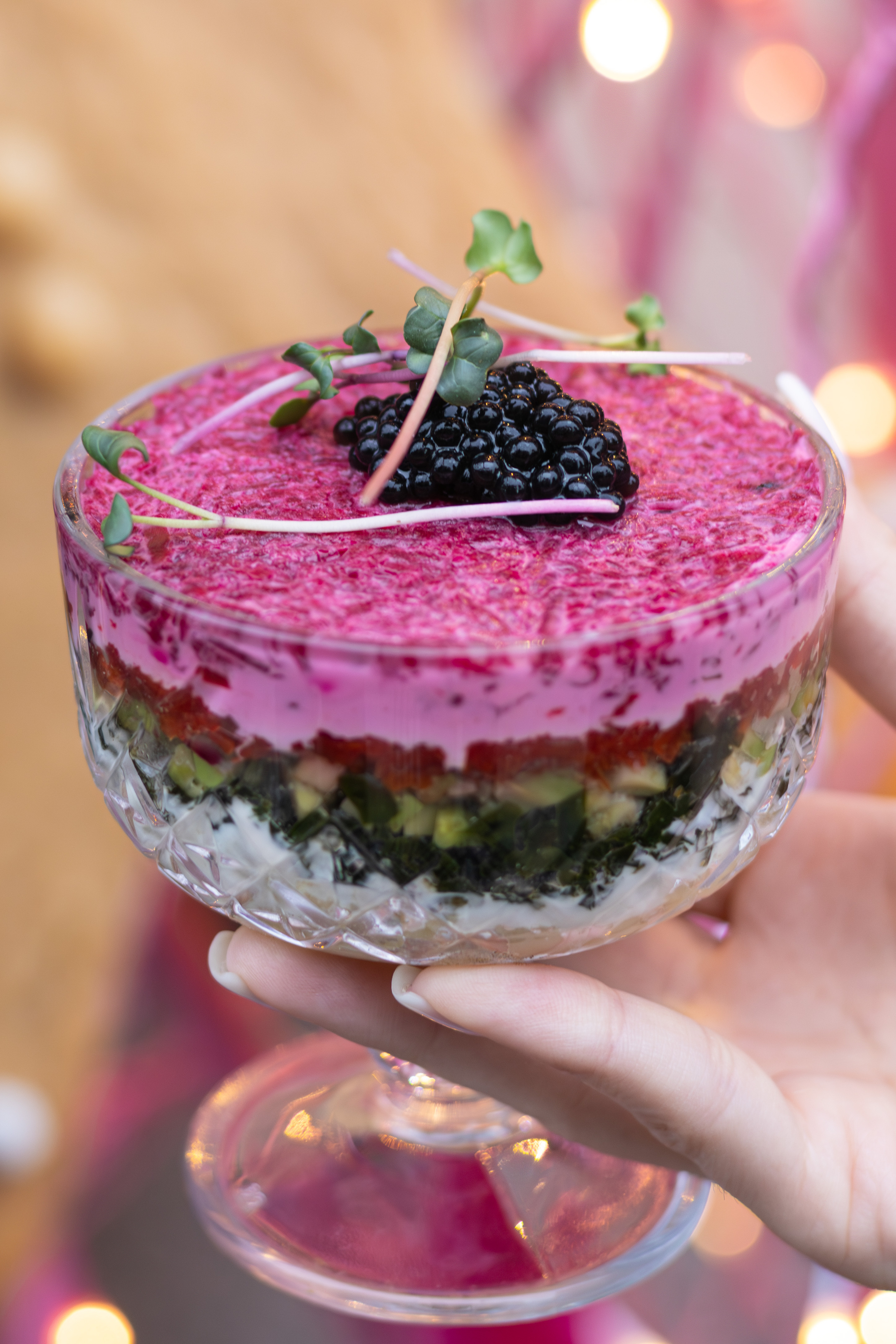 Свекла, картофель, морковь, вакаме, авокадо, веган-майонез, черная икра, соевый соус, льняное масло.