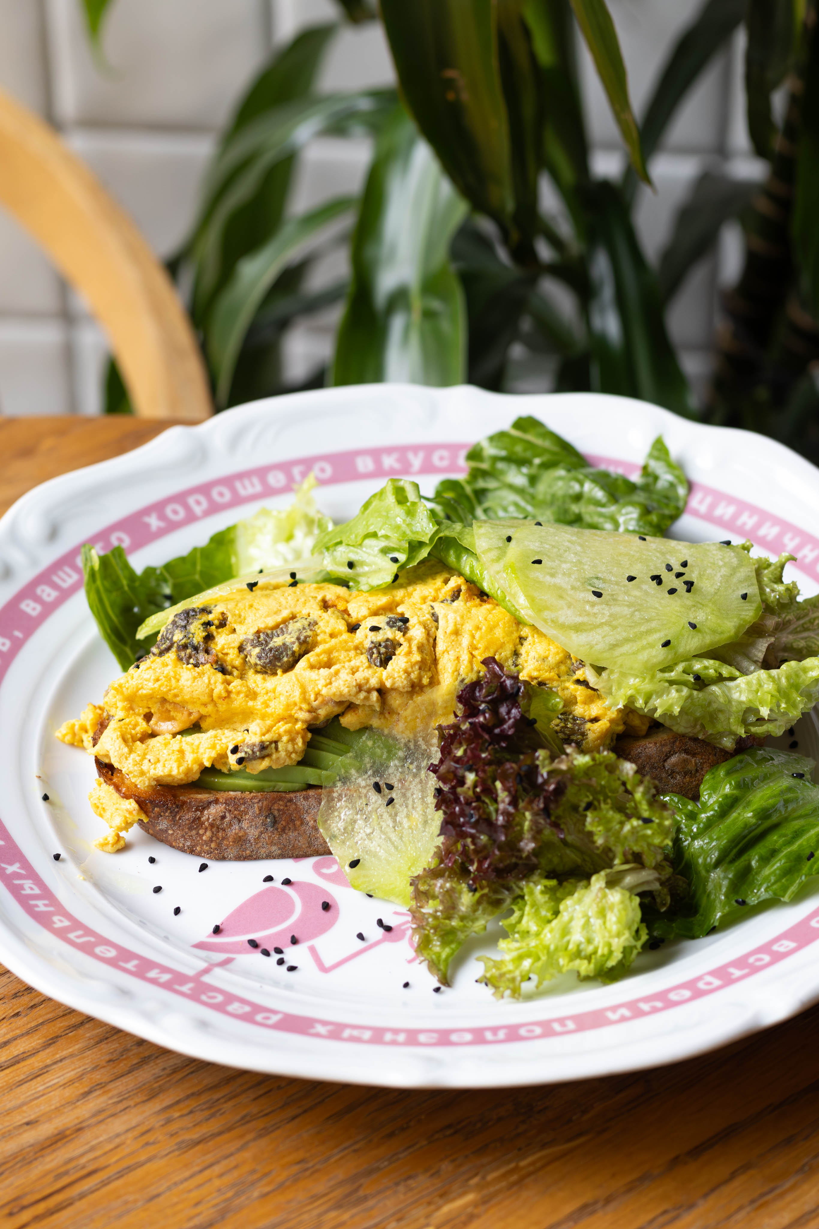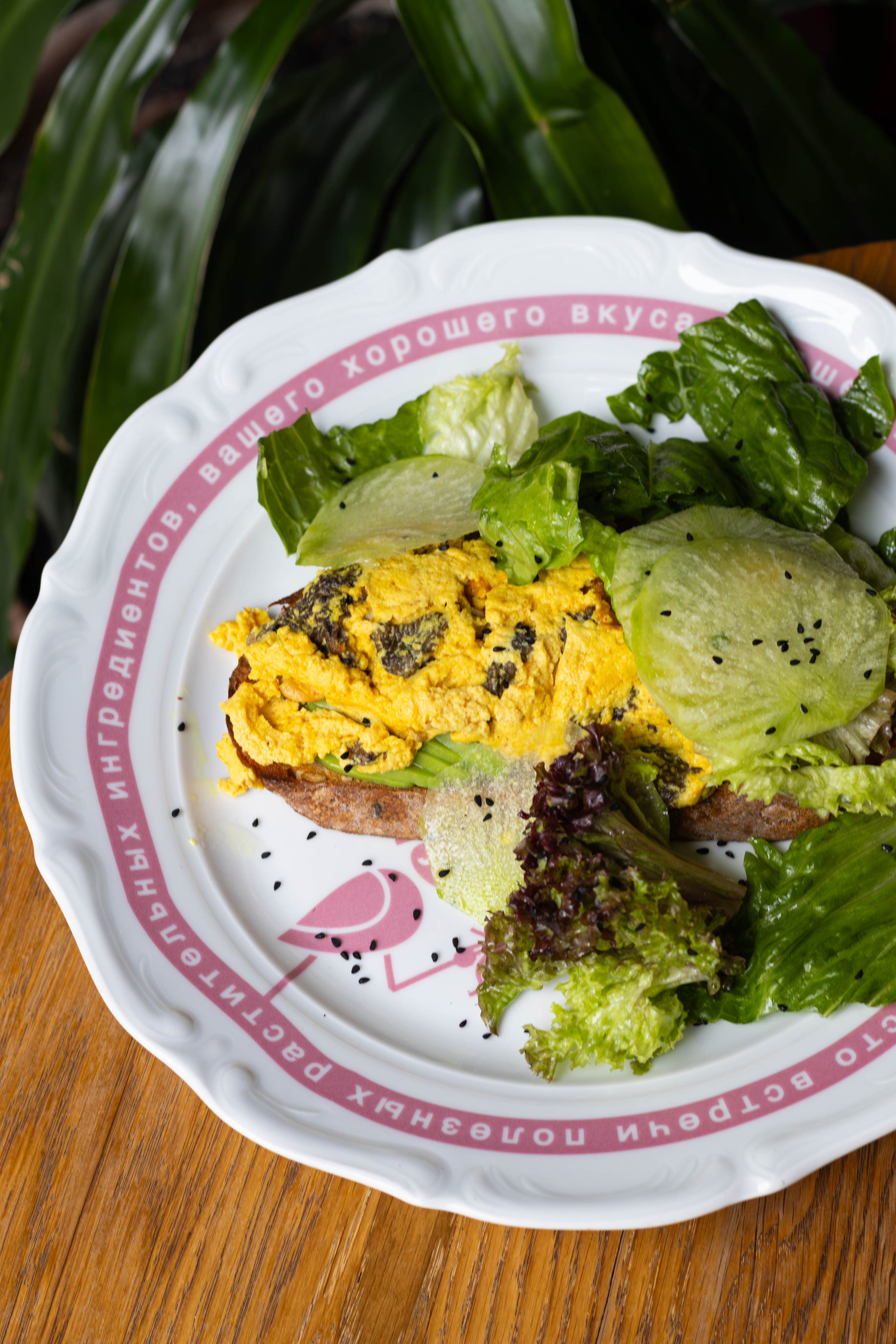 Нежный скрэмбл из тофу с кремовой текстурой, грибы сморчки, гречневый хлеб, авокадо, соевое молоко, романо, зеленая редька, лоло росо, сок лайма, оливковое масло, чесночное масло, тмин, копченая соль.