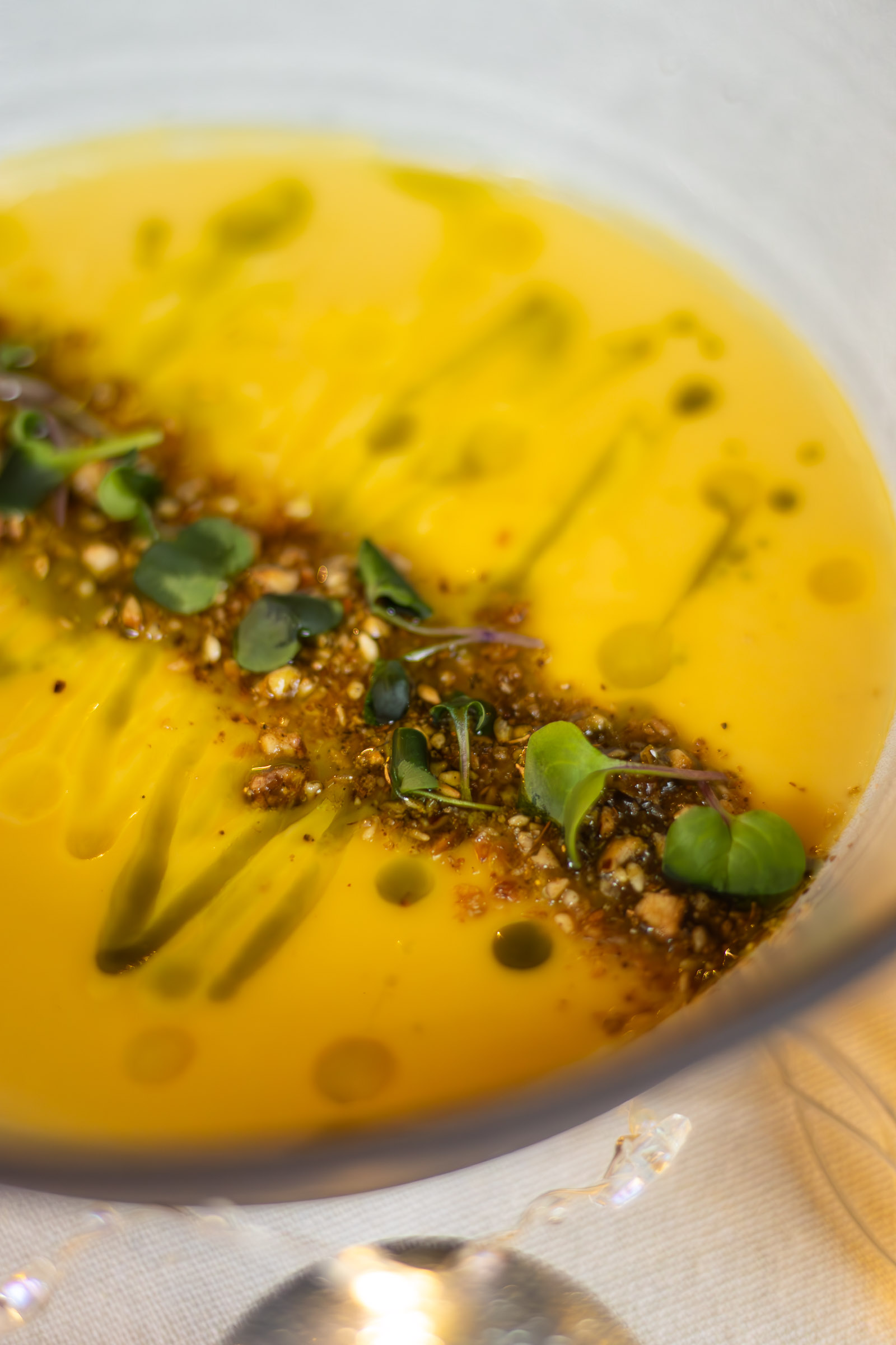 Цветная капуста, корень сельдерея, морковь, лук, кокосовое молоко, вино, овощной бульон, чеснок, тимьян, зеленое масло, трюфельное масло, дукка, микрозелень.