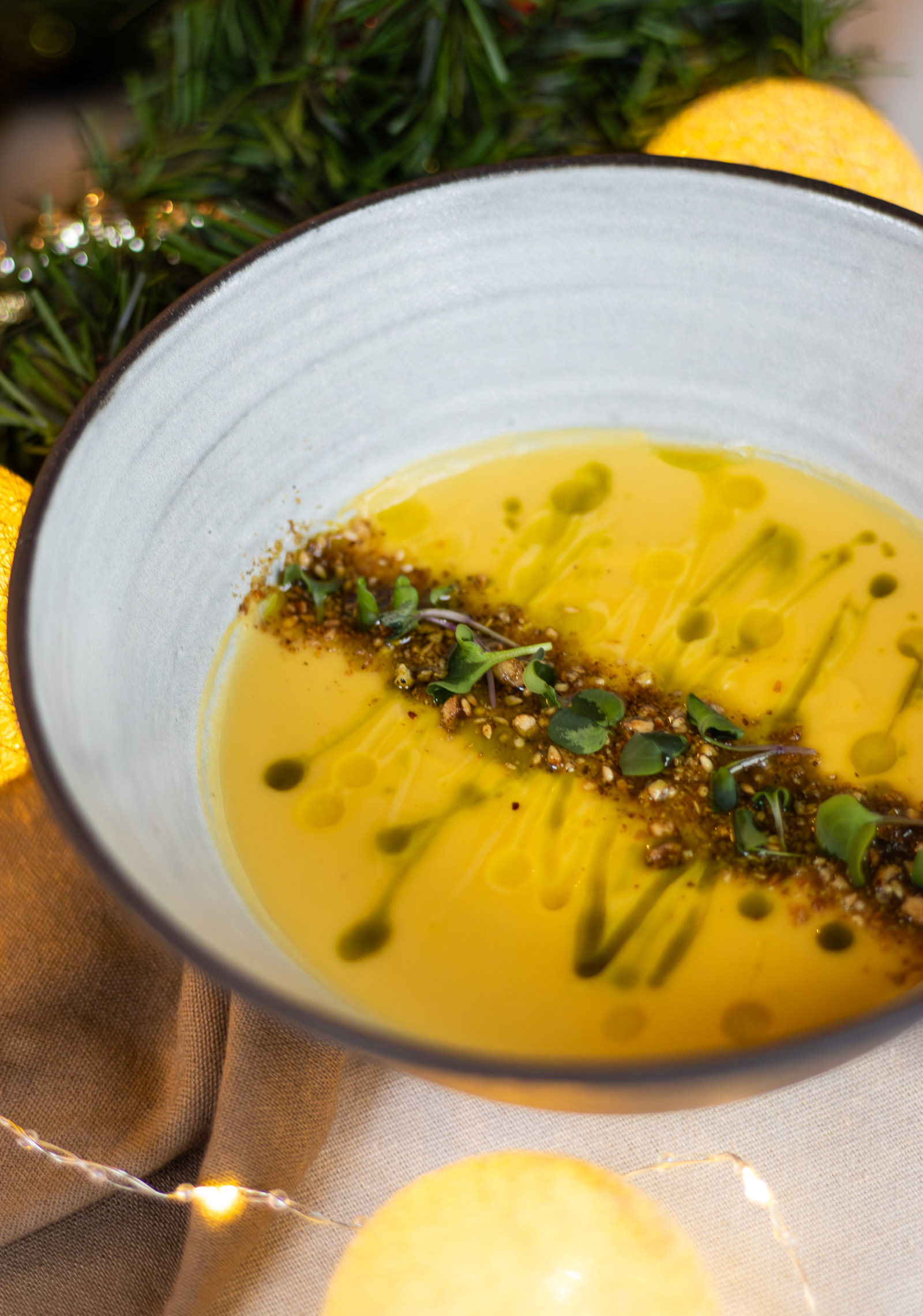 Цветная капуста, корень сельдерея, морковь, лук, кокосовое молоко, вино, овощной бульон, чеснок, тимьян, зеленое масло, трюфельное масло, дукка, микрозелень.