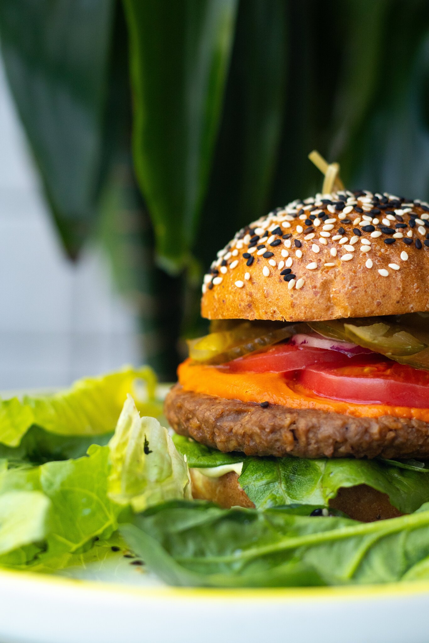 Котлета BEYOND MEAT из растительного "мяса", домашняя булочка с кунжутом, салат романо, халапеньо, кешью сыр, BBQ соус, томаты, лук красный. соленый огурец. Подается с миксом салатных листьев : романо, шпинат, руккола , мангольд , бок чой , красный щавель.